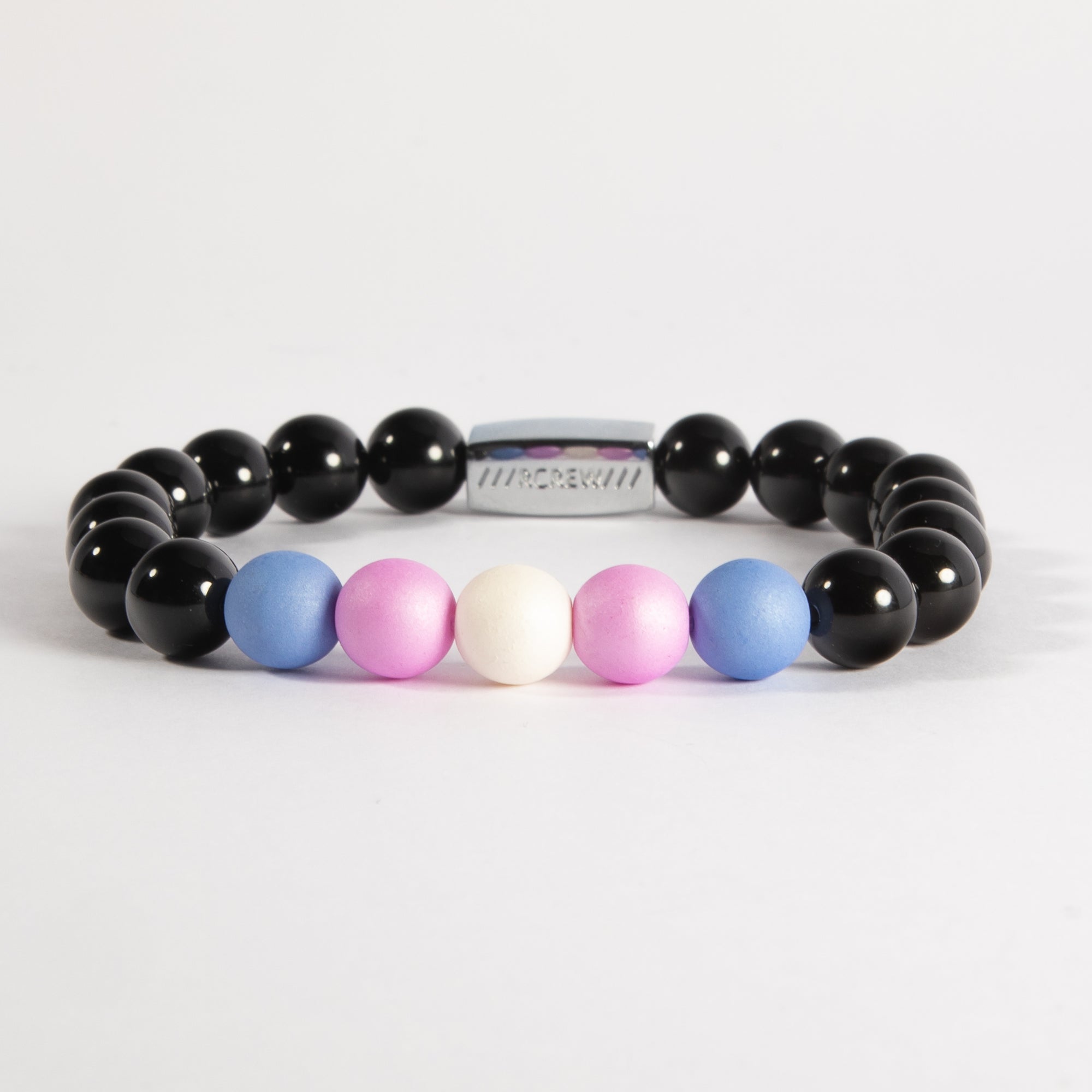 The Bold Trans Bracelet translates the colours of the Transgender Pride Flag into a wearable signal. Light blue, pink, and white beads, grounded by genuine black agate quartz, create a bracelet that's instantly recognisable to those who know the code, and a great-looking bracelet to everyone else.