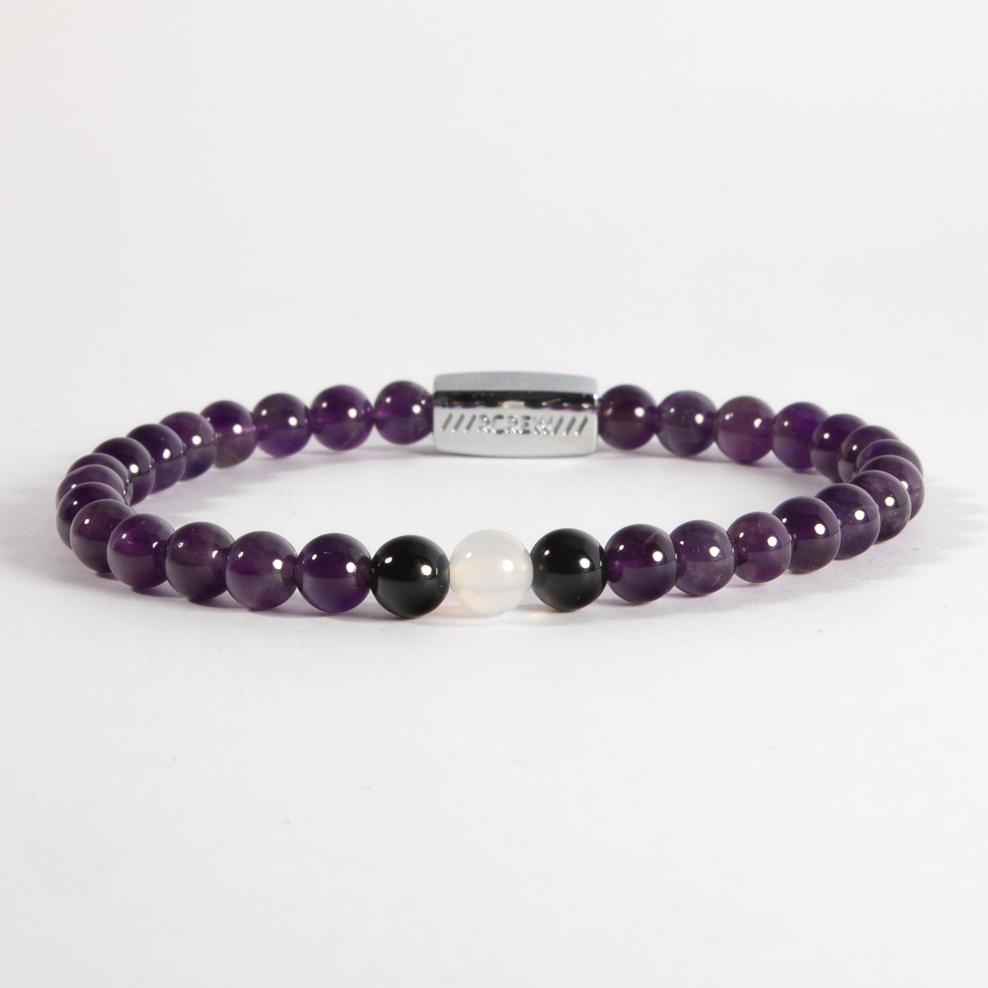 The Labrys flag has always been about strength. This bracelet carries that spirit in natural stone: deep amethyst, white agate, and black onyx create a palette that's bold without being loud.